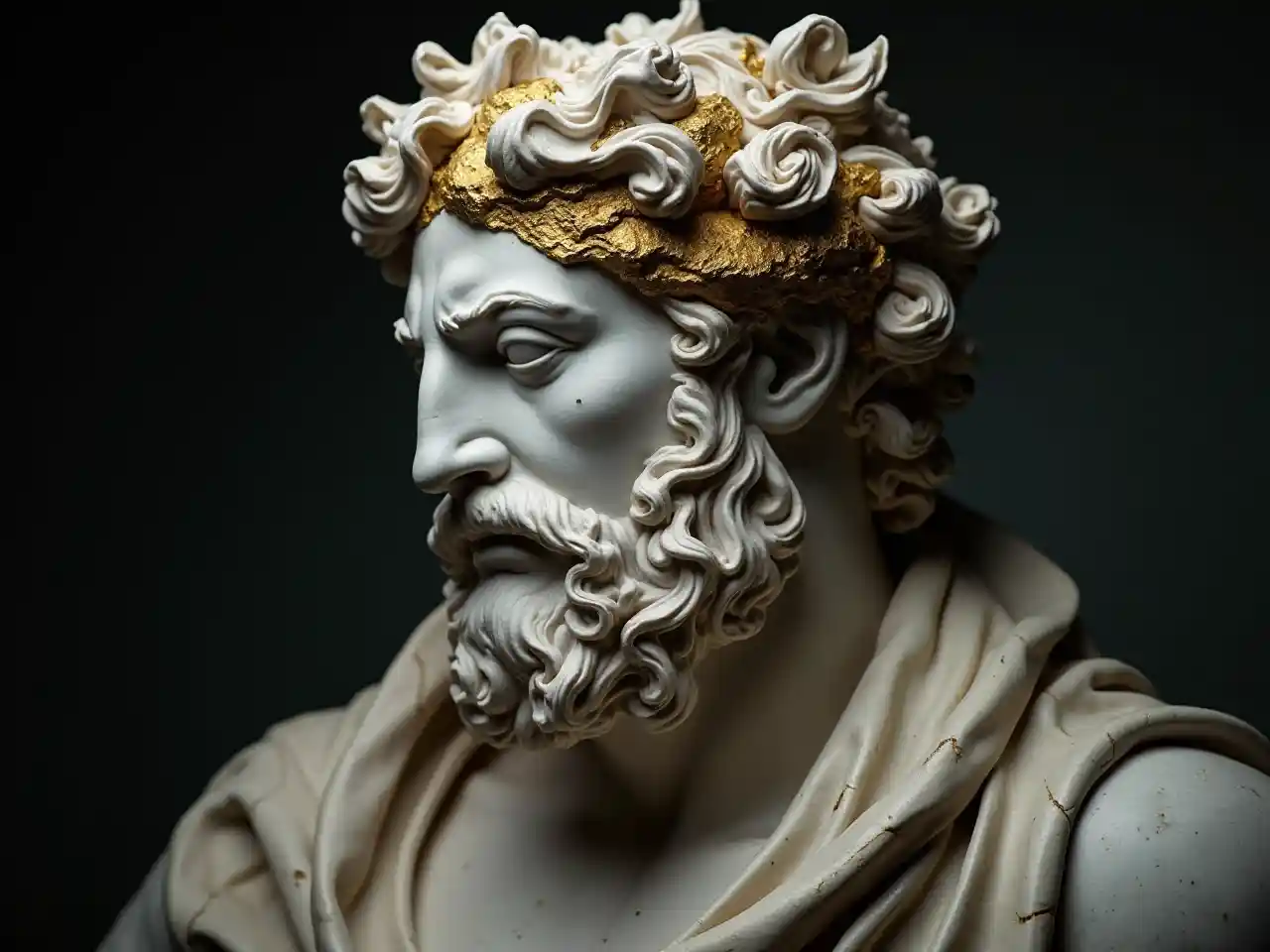 Sanamu ya marumaru nyeupe iliyopasuka ya Mungu wa Kigiriki na sifa za Kiafrika na dhahabu ndani, taa za studio, background nyeusi