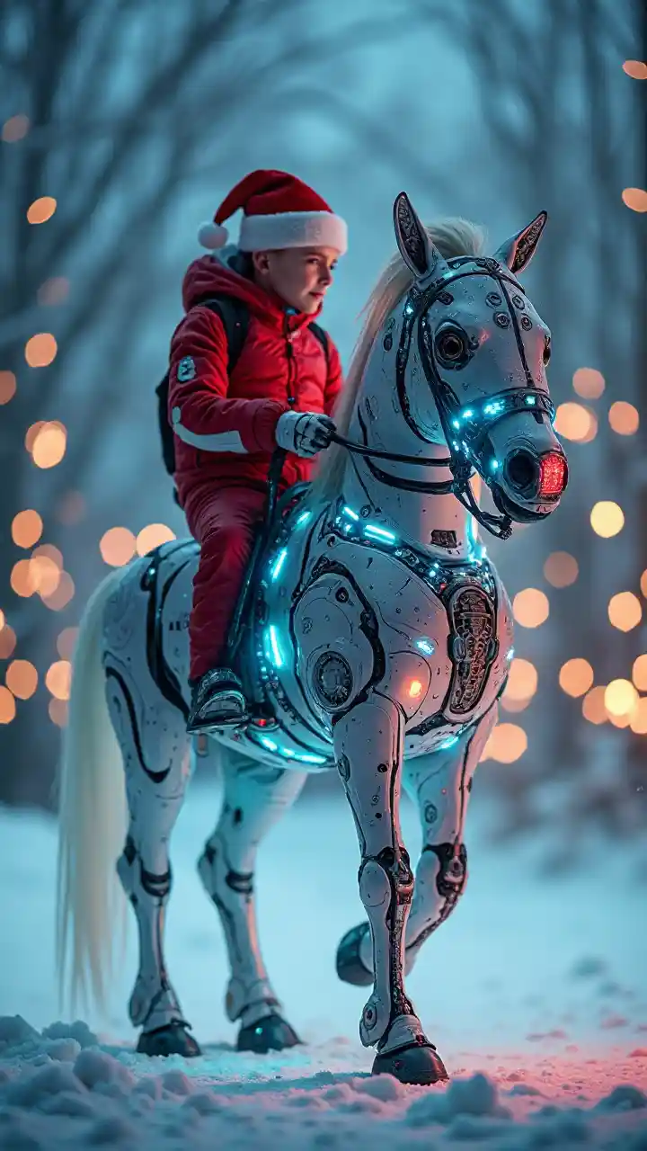 Futuristic AI-robot farasi ameketi juu ya farasi, (slick metallic design), taa kung'aa, mifumo tata mzunguko, (Santa kofia), sherehe, maelezo tata, vipengele sci-fi, (rangi ya kuchochea), anga ya kuvutia, theluji background, (highly detailed), (4K), taa ya kuvutia, ya kisasa ya likizo.