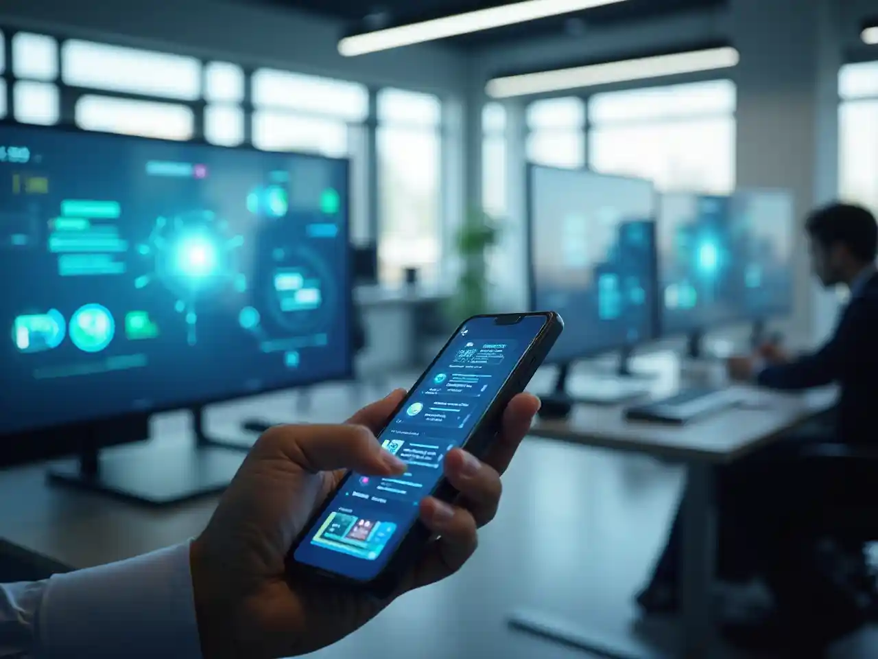 AI is everywhere Scene Description for Image Creation: Setting: A sleek, modern office with large windows letting in soft natural light. The space has minimalist decor, with clean lines and a futuristic feel. Workstations are equipped with large, high-resolution screens displaying various types of data and AI-generated interfaces. Central Focus: A hand, perhaps a slightly older one with a professional appearance, holding a smartphone. The screen of the phone glows brightly, showing a smart assistant interface or an AI chatbot interacting with the user. The colors on the screen are vibrant, with holographic-like buttons and digital icons. Background Elements: At nearby desks, other employees interact with larger screens showing advanced AI tools like predictive analytics dashboards, robotic process automation systems, or voice-controlled systems. Some of the screens might have charts, graphs, or even virtual assistants in holographic form. Atmosphere: There’s a sense of calm and focused productivity. The space feels quiet, efficient, and futuristic, with subtle hints of artificial intelligence integrating seamlessly into the daily workflow.