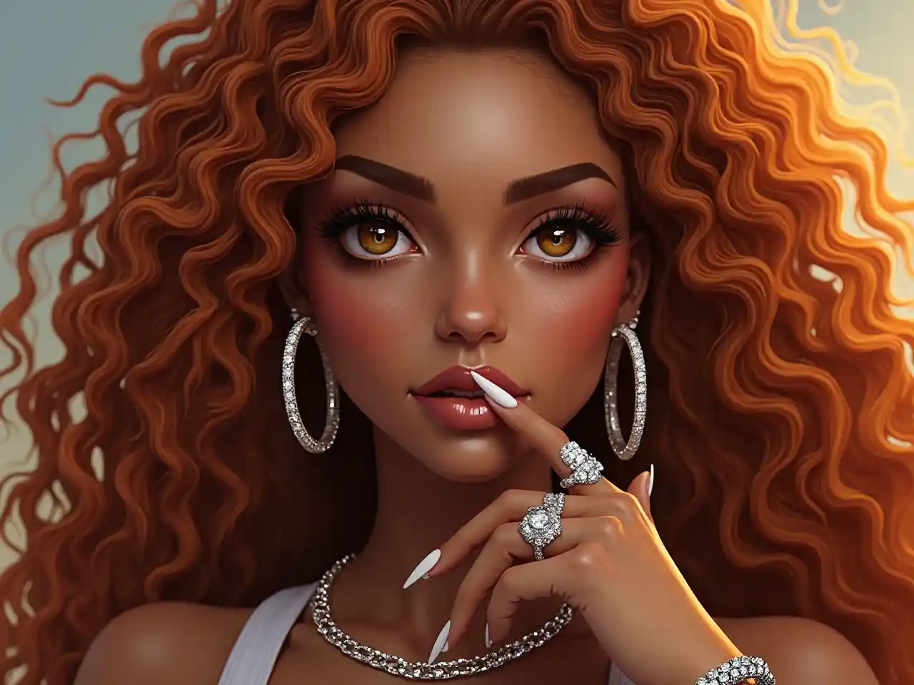 Airbrush/kweli cute kahawia ngozi uzuri,na macho ya hazel na nywele ndefu Brazil na nywele rangi ya machungwa,na nguo mitaani,na misumari mirefu ya akriliki,na kubwa 3D fals full eyelash,na pete kubwa almasi,Cuban kiungo vifungo,na pete za almasi
