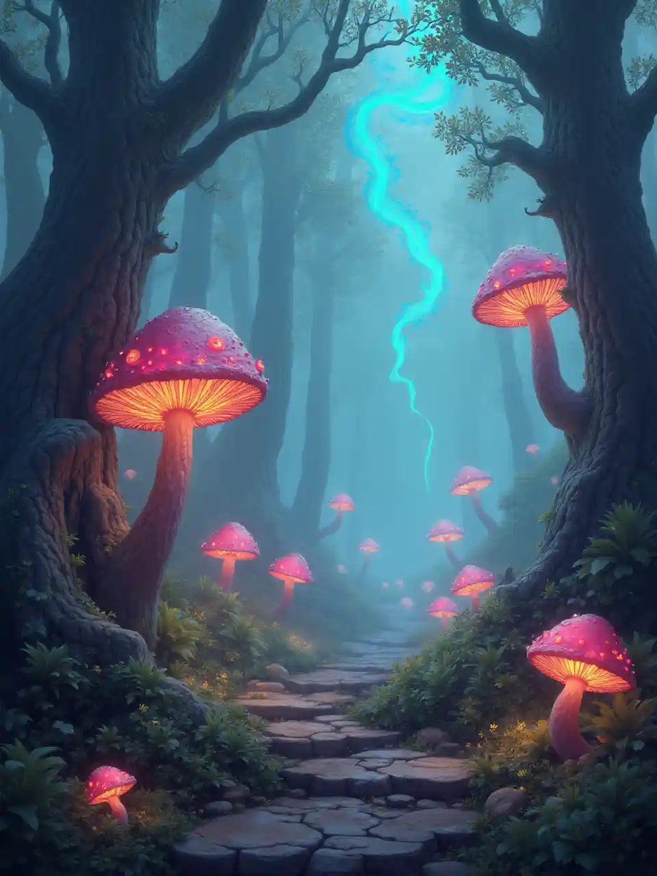 Alayna Lemmer, ulimwengu wa ndoto, msitu wa kifumbo, uyoga wenye nguvu unaotoa mwangaza laini, anga la ubunifu, moshi wa rangi nyingi unaopenya miti, viumbe vya kipekee vilivyofichwa kwenye ukungu, mandhari ya kuvutia na ya kufikiria.