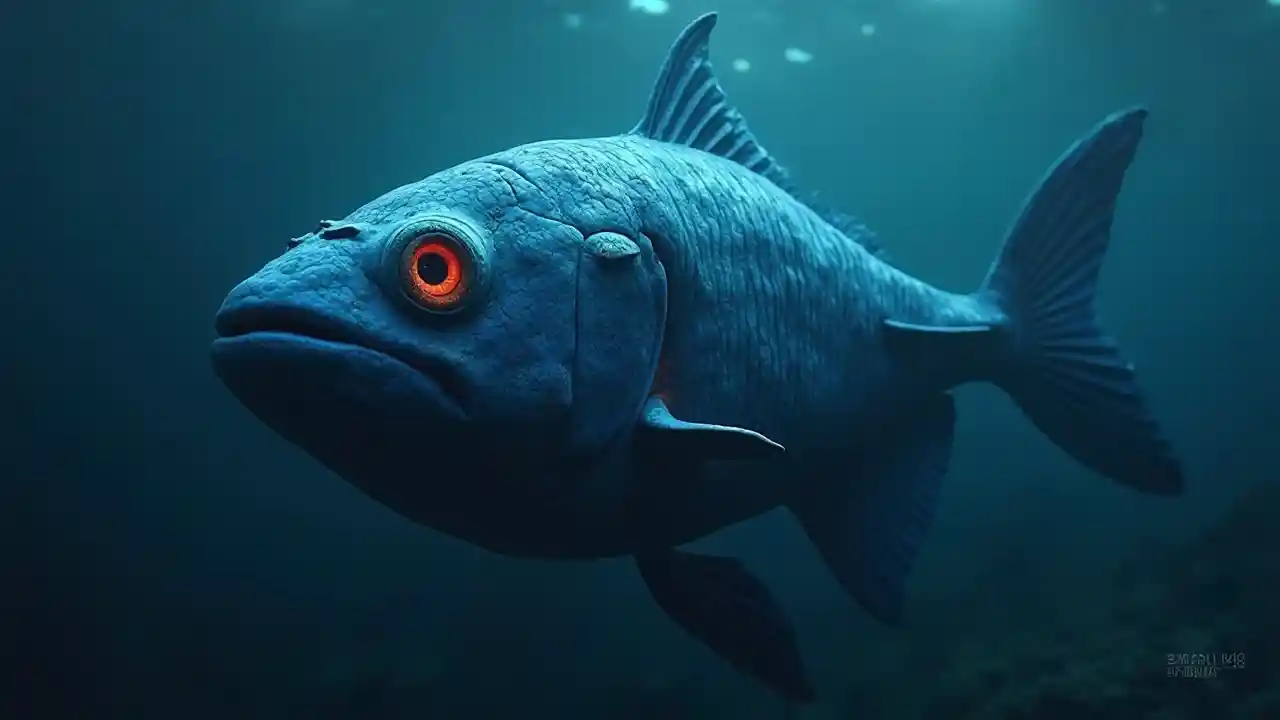 Samaki mkubwa wa bluu kutoka sayari nyingine katika maji ya giza na macho nyekundu