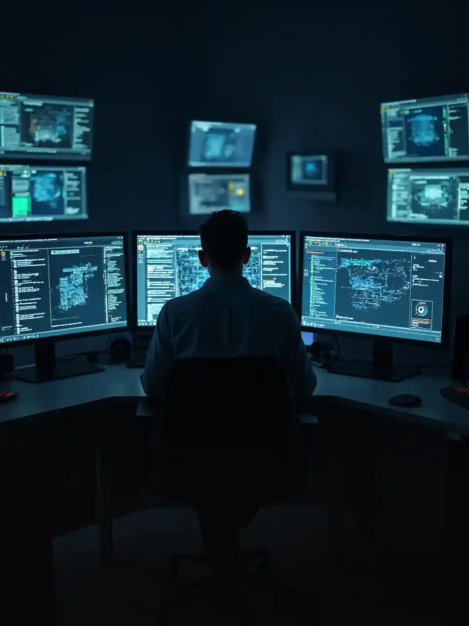 mtu ameketi mbele ya kiwambo kompyuta kufunikwa na data juu ya dawati katika chumba giza na monitors nyingi, Andries Stock, les automatistes, cybernetics, computer graphics