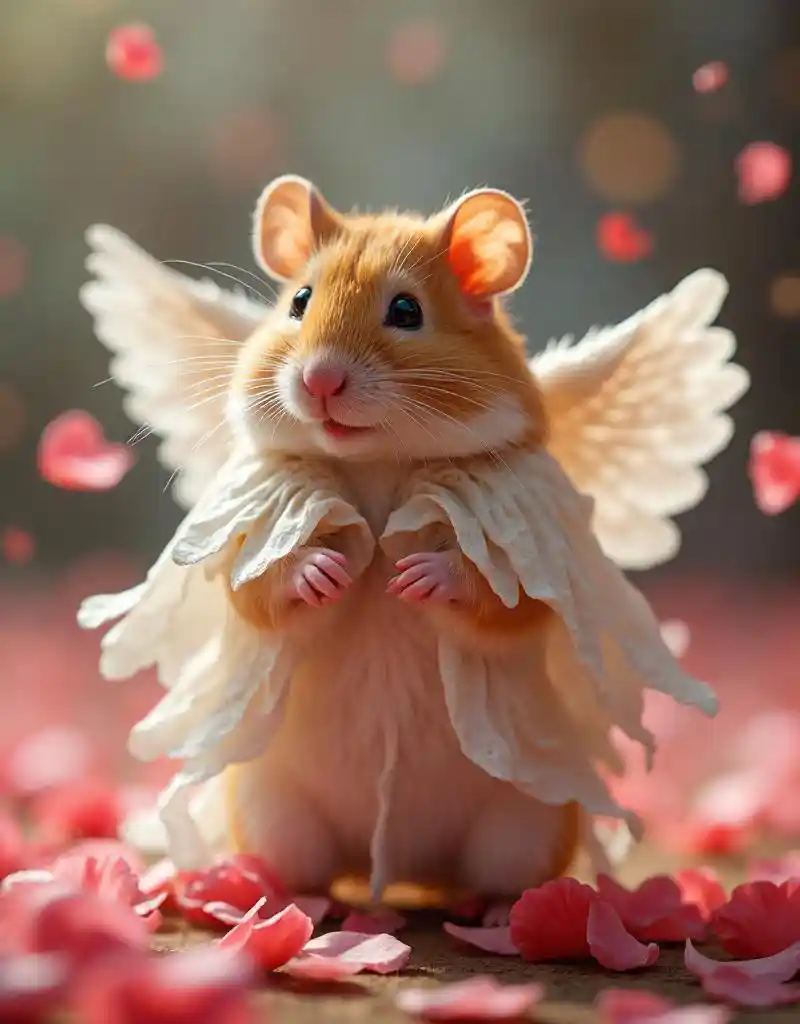 masterpiece, best quality, photorealistic, realistic, photography, A hamster dressed as an angel with fluttering rose petals