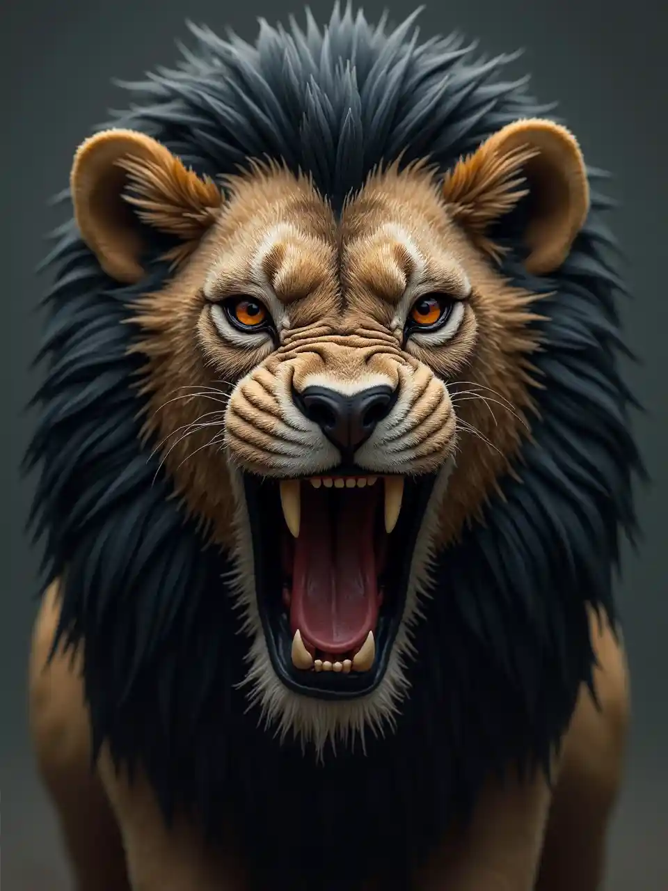Kujenga simba hasira halisi na macho, na nywele nyeusi kuangalia mbele ya kamera na kunguruma katika 3D