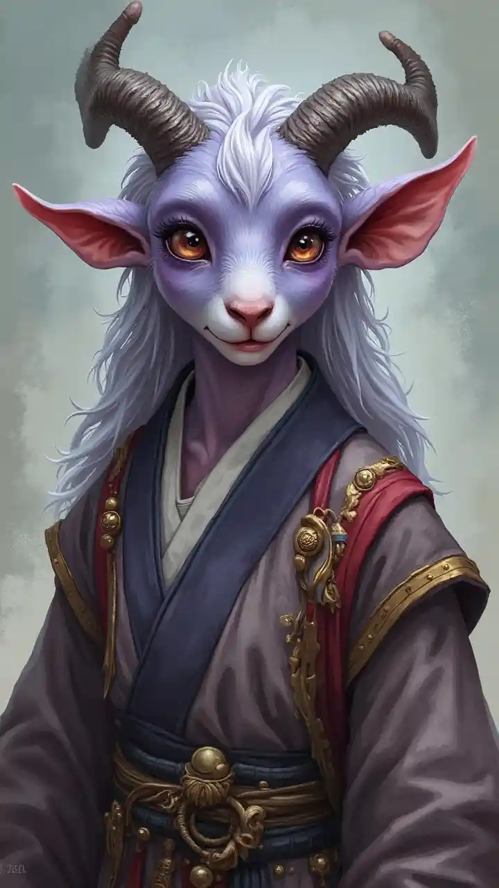 Aidendnd, light purple or blue skin, animal features, fur, whisker eyebrows, goat eyes, sheep nose, firbolg wearing asian clothing, only one pair of ears, long floppy elf ears at the sides of head.