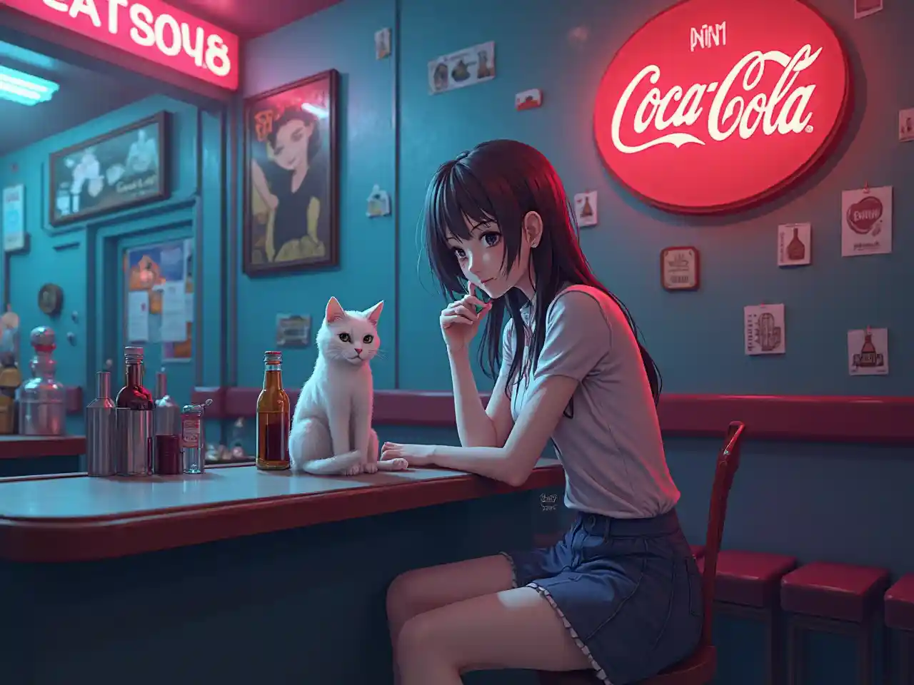 Harperretro anime style picha, mwanamke Kijapani ameketi katika bar na paka nyeupe, Coca-cola ishara juu ya ukuta, bluu na rangi ya neon taa