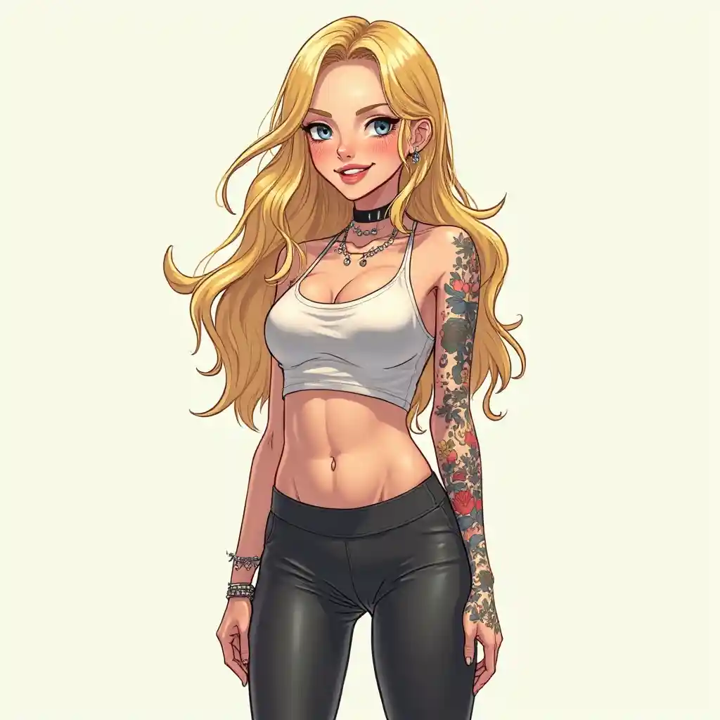 Sweet, wasio na hatia, cute (((kubwa umri wa miaka 30) American blonde vibe msichana, leggings na mazao ya juu., ((mchoro kama karatasi ya kubuni)). "DrBlues" tattoo, (((Uhalisi, 3D))). ((Dynamic flirty pose, tabasamu.))