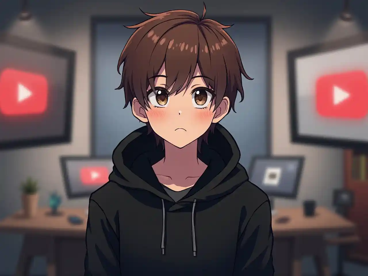 Brynnkujenga 18 mwenye umri wa miaka anime mvulana amevaa nyeusi hoodie na YouTube studio background na rangi ya nywele ni kahawia