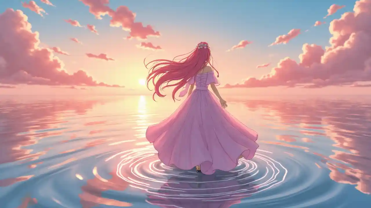 msichana mzuri anime kutembea juu ya maji na muda, nywele pink kwamba ni halisi rangi ya zambarau mavazi ya harusi ambayo ni anime na yeye jua na mwanga wa jua kidogo zaidi ya kweli