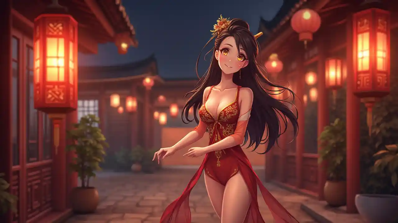 Picha ya kiwango kikubwa ya msichana wa Ultra HD, mzuri na mzuri, aliyeangazwa na mwangaza wa taa, amesimama kwenye ua wa jadi wa Kichina usiku, akivaa hanfu inayoonyesha na shingo ya kina na mikono ya wazi, nywele zake ndefu zilizopambwa na nywele na tabasamu ya joto, macho makubwa ya kuangaza, ngozi nyepesi, rangi nyekundu na dhahabu, sifa nyororo, vipodozi vyenye utu, vifungo vya kimapenzi, taa ya joto na mwangaza, akika kifua chake cha kupendeza, kilicho na kipa cha, na miguu mirefu, yenye nguvu, na hali ya kupendeza, ikitoa charm na uzuri.