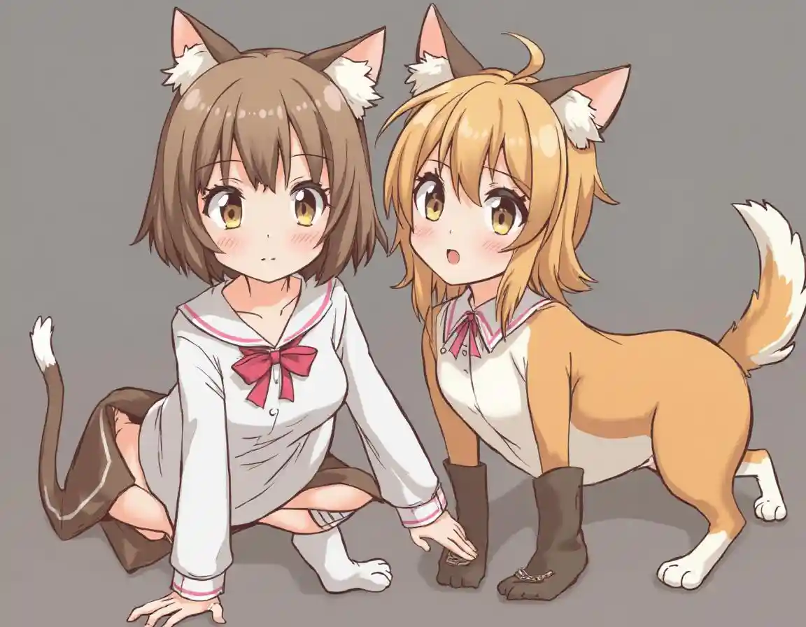 nsfw, ((kiongozi), uso kamili, ubora bora, style anime kuchorwa kwa undani sana, uso wa kina, ((1 cat girl,on the left side,cat ear,cat tail,cat pose), ((1 dog gi