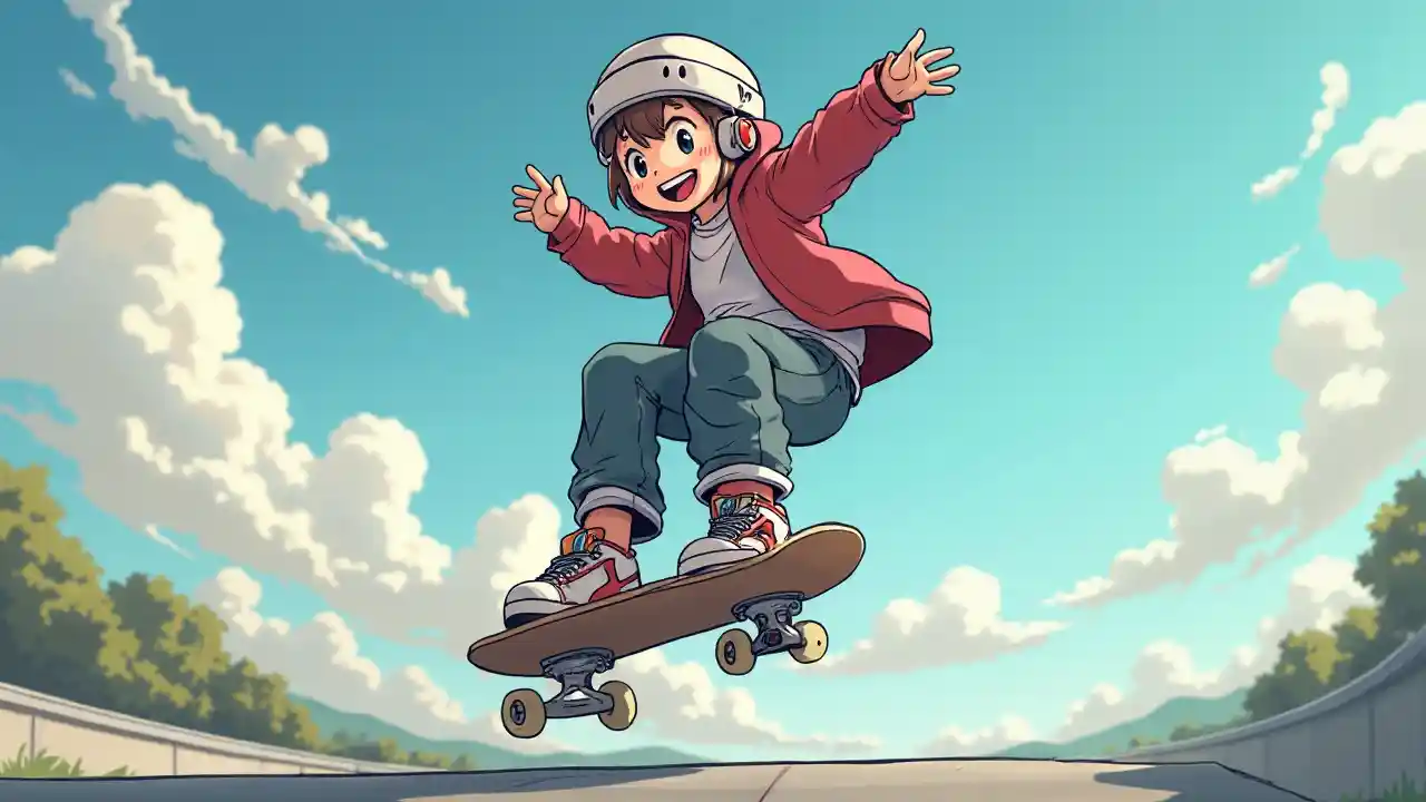Anime 28 mwenye umri skateboarding tabia Rolling na kucheka