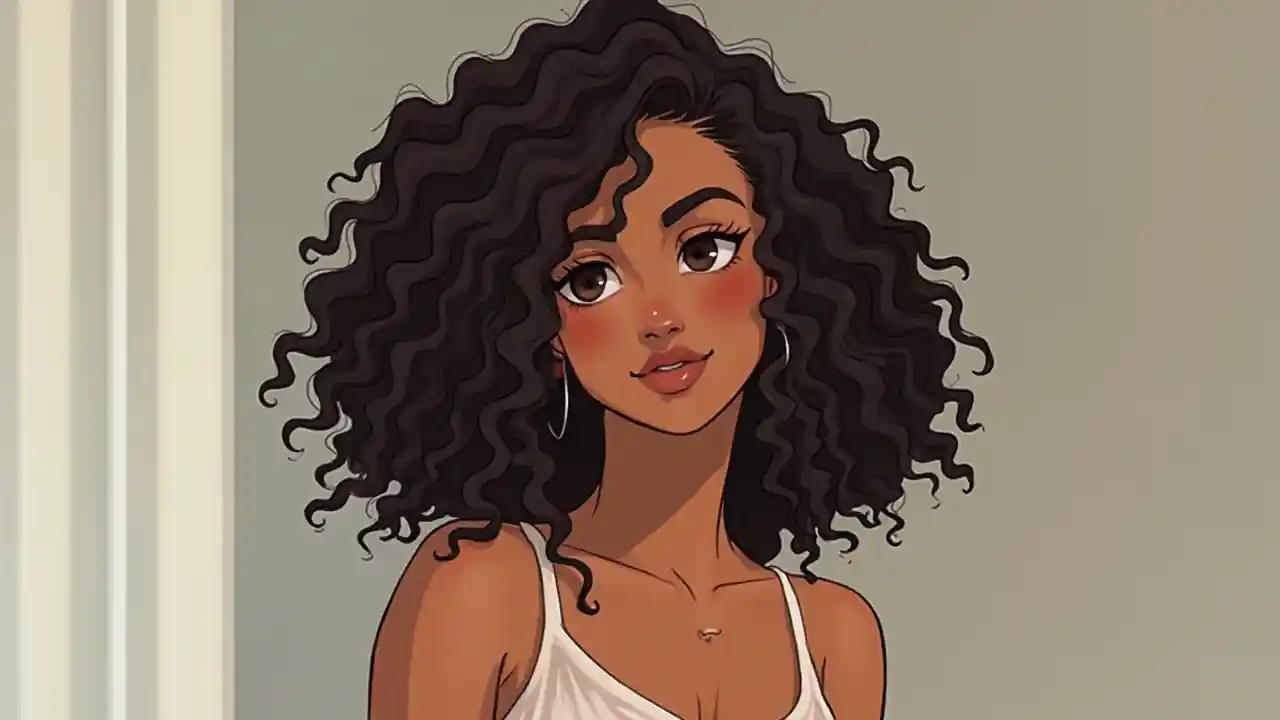 Mwanamke wa Amerika Kusini na nywele 3c curly, urefu wa kati na ngozi ya zeituni. Mtindo wa Anime