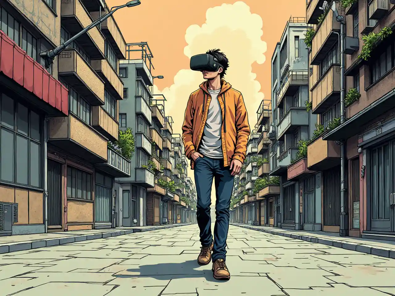 Vintage 90s style. wanaume wapweke kuvaa headset virtual kweli kutembea chini ya barabara; na Hajime Sorayama, Greg Tocchini, Virgil Finlay, sci-fi. line art. mazingira arcade art.