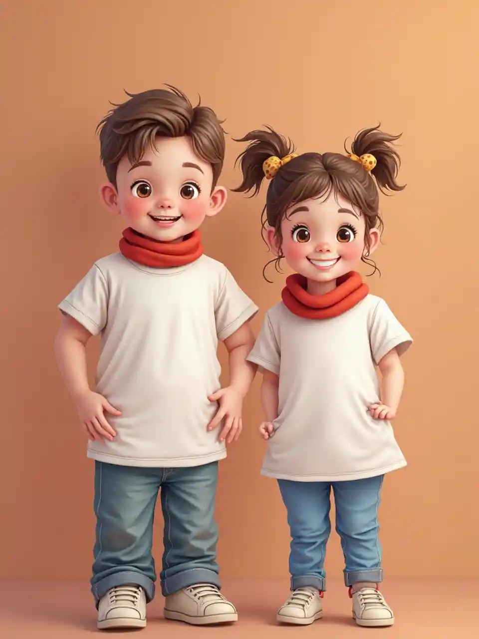 mtindo vector , mvulana mdogo na msichana amevaa mashati nyeupe, sketi nyekundu kuzunguka shingo, amesimama mbele ping background, mashati tupu hakuna kuchapisha, 3 umri wa miaka tabasamu watoto, picha kwa ajili ya mavazi ya