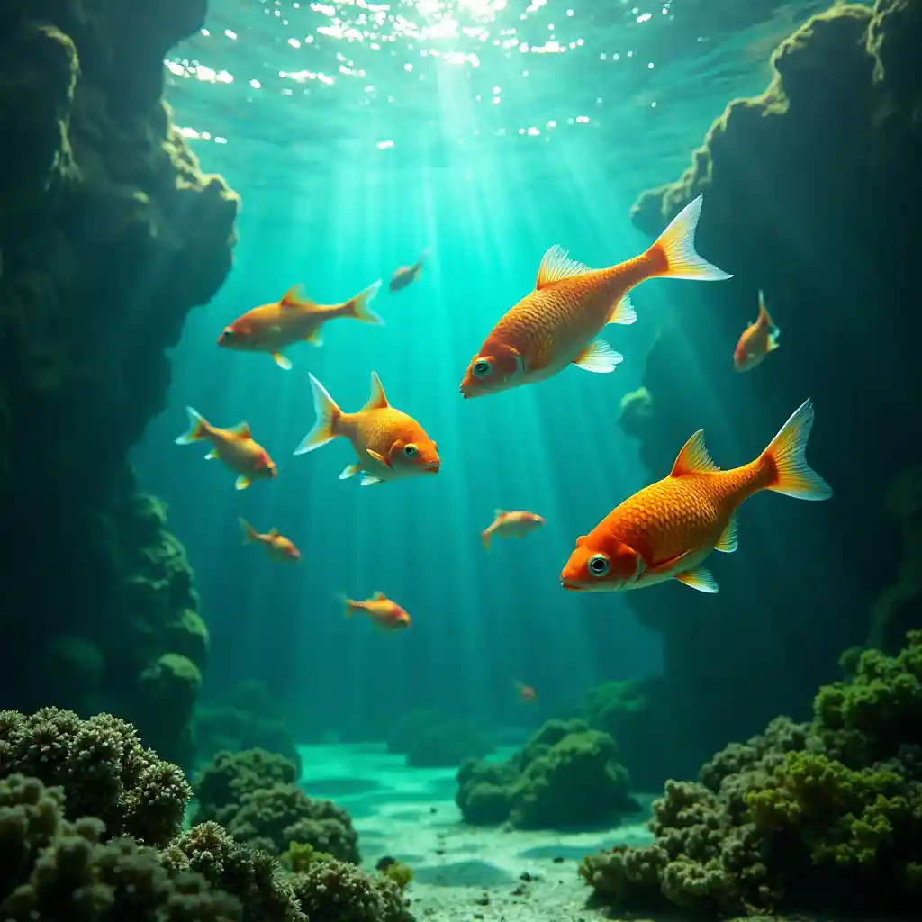 Picha ya chini ya maji. Com Águas Translucidas. Maji ya kijani. Samaki wa rangi nyingi wanaogelea katika picha. Uwepo wa matumbawe ya rangi na algae na matoni tofauti ya kijani. Nuru nyeusi na ya dhahabu iliingia ndani ya maji.