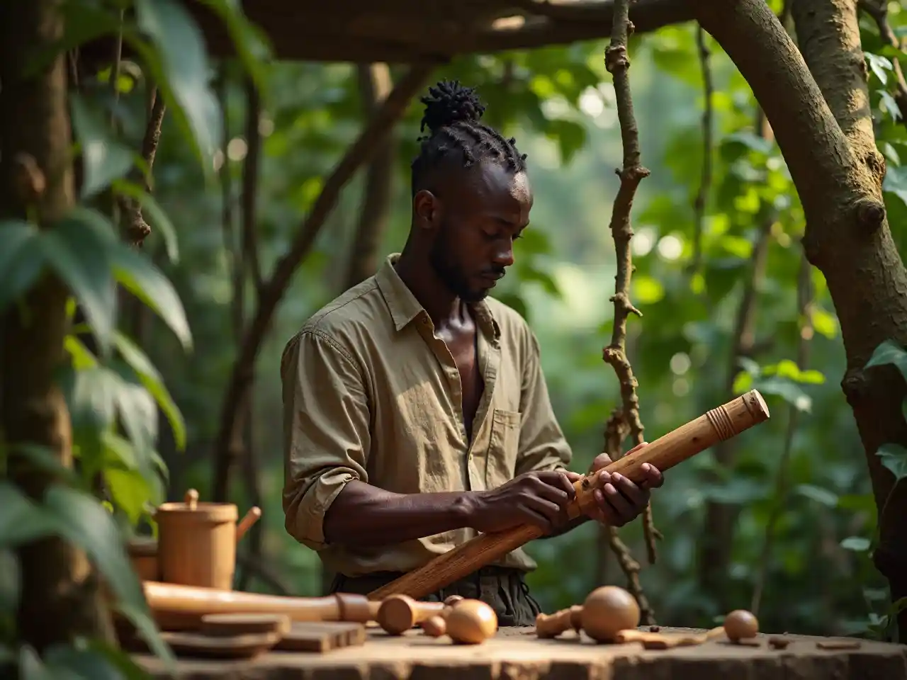Crafting a bamboo flute in a jungle workshop, a Black man in his 25s glows in a linen shirt. Vines and wooden tools frame him, his skilled hands and calm focus exuding artisanal passion and primal charm in a lush, natural setting.