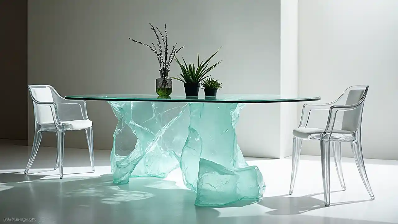 ChloeMeza na kiti kubuni, samani kubuni, nene glasi meza ya kulia, barafu kama meza, irregular, mwanga kiti na mimea juu yake, An Gyeon, kundi gutai, artgem, hologram, picha halisi