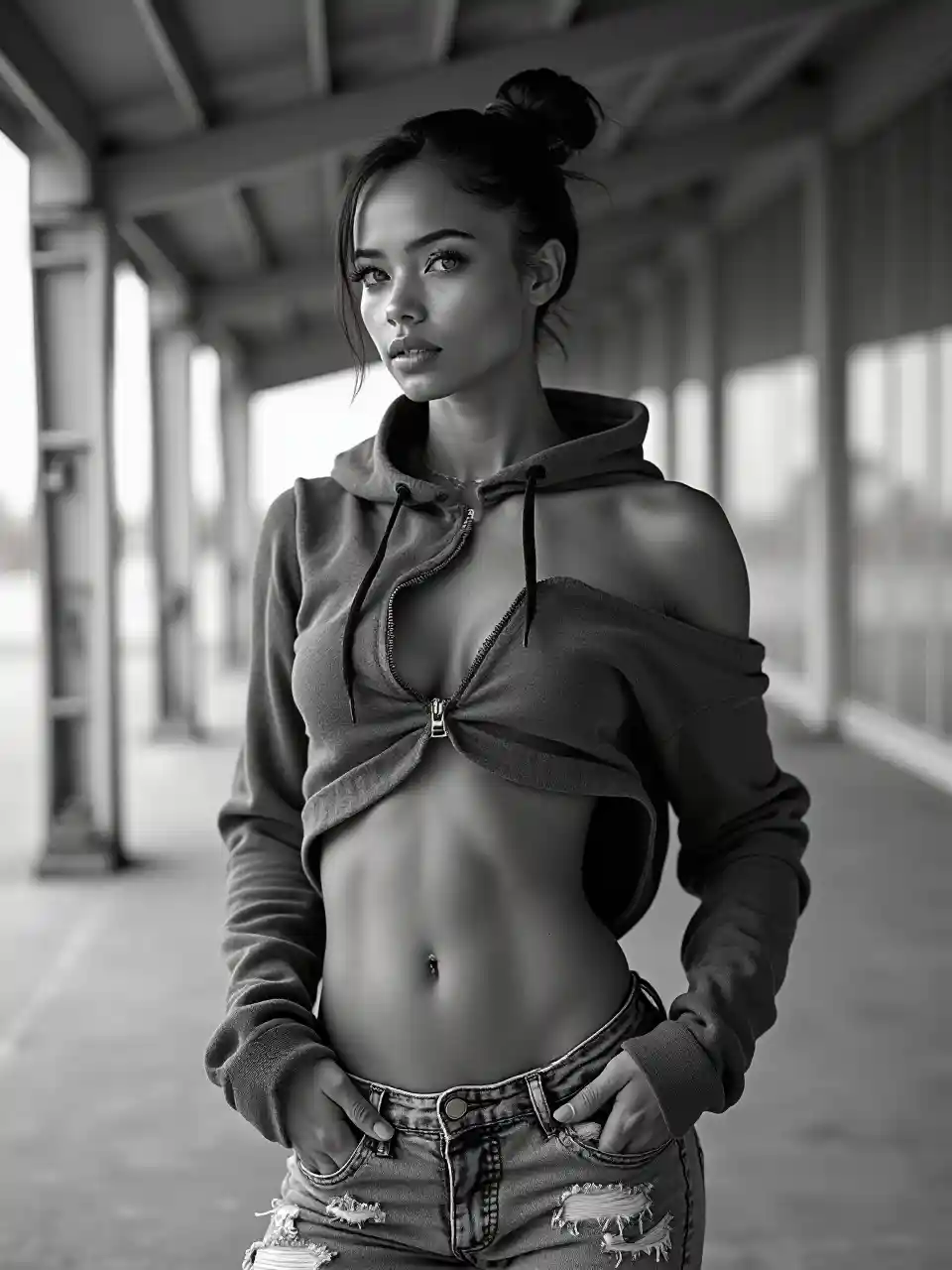 Picha nyeusi na nyeupe inaonyesha mwanamke wa kabila la Fulani, mwenye umri wa miaka 24, na mwili wake wa kuogelea wenye neema, na hisia za kushangaa. Mwili wake wenye umbo la kuchonga, mikono yake ikiwa thabiti na ngozi yake ikiwa laini na yenye nguvu, ni uthibitisho wa misuli yenye nguvu na viungo vya ndani vilivyo wazi. Ana kifua cha gorofa na matiti madogo, na ngozi yake nyeupe hutoa mwangaza wa asili, ikichukua nuru na kufunua viini vya ngozi yake kwa undani. Macho yake yenye rangi ya kijivu, yenye umbo la ngao, yenye vipele vire, yanaonekana kwa uangalifu. Vipaji vyake vya uso vimeinama na vimejaa vichaka, na hivyo kuonyesha nyuso zake zenye kupendeza. Anavaa koti lenye vipande vingi, lenye zips zilizo wazi, na kufunua kiuno chake, pamoja na jeans zenye kukata. Mwili wake umegeuzwa na mkono mmoja umeingizwa mfukoni, ukiwekwa kulingana na sheria ya tatu. Nyuma yake, nguzo za chuma zilizovunjika huinuka ili kutegemeza paa, na hivyo kuunda mandhari yenye mapambo ya kuondoa. Uumbaji wote wa picha unaonyesha mtindo wa Viviane Sassen na mambo madogo ya ubunifu.