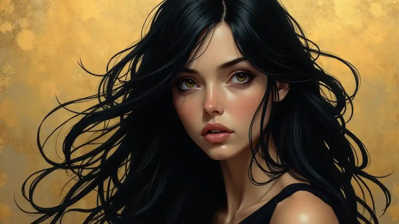 Mwanamke mwenye kuvutia mwenye nywele ndefu nyeusi zenye kuvutia, akiwa na mandhari ya rangi ya dhahabu, iliyoongozwa na mtindo wa kuvutia wa Charlie Bowater. Macho yake yenye kuchochea hisia yana miundo midogo ya rangi ya bluu na nyeusi, ambayo yanakumbusha kuhusu nyimbo za Michael Garmash. Kazi hiyo ya sanaa ina uvutano wa sanaa ya vichekesho, na ina rangi nyingi za rangi nyeusi na rangi ya rangi ya manjano. Mandhari hiyo imefunikwa na hali halisi, ikichanganya mambo ya ajabu na mambo ya kina, ikichukua mawazo ya mtazamaji na kumvuta katika ulimwengu wa uzuri na kina kisicho na wakati.
