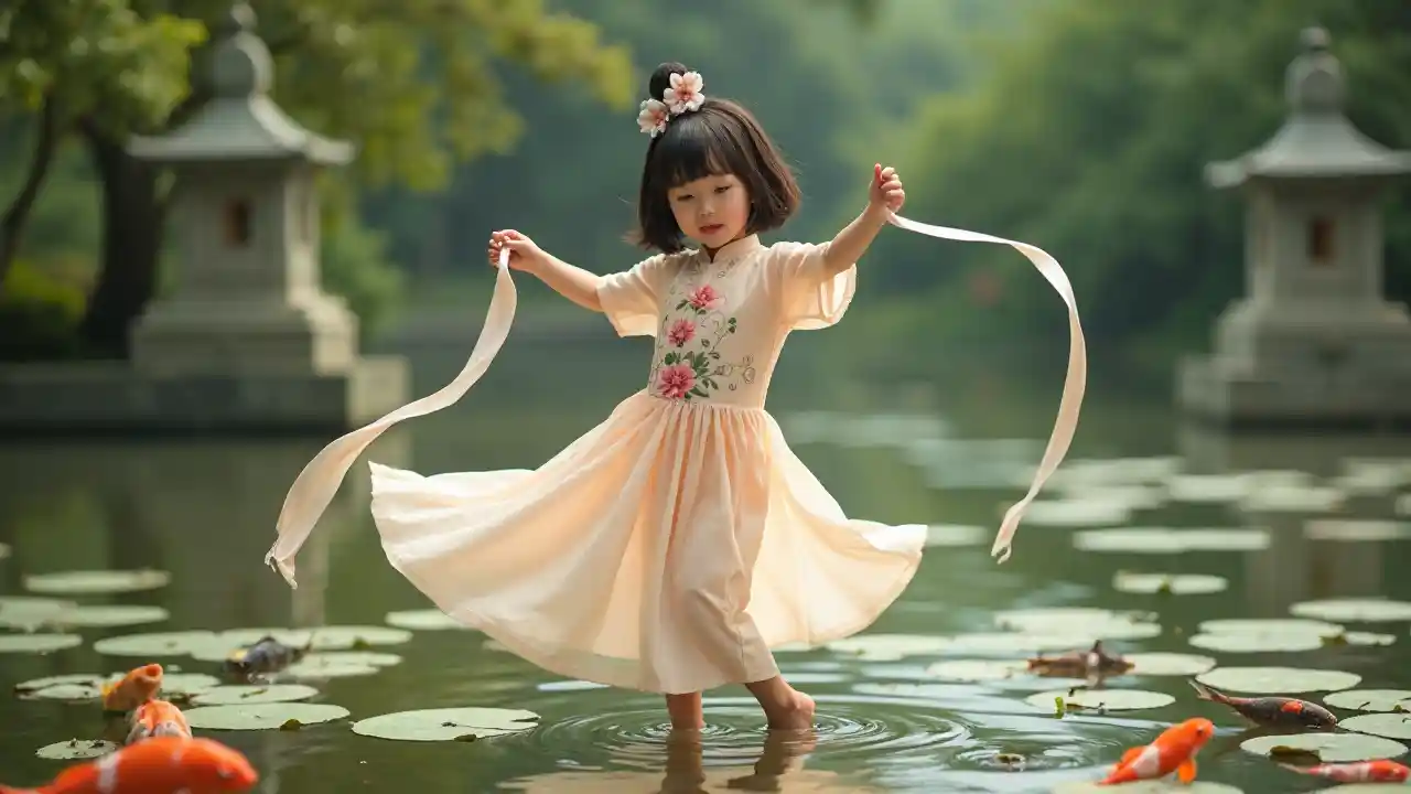 Msichana wa Asia mwenye umri wa miaka 7 mwenye nywele za bob, anacheza dansi akiwa na mkanda katika bwawa la lotosi, akiwa amevaa mavazi yaliyo na vilemba vya lotosi. Samaki wa aina ya koi na taa za mawe humweka ndani ya sanamu, na mizunguko yake yenye neema hutoa umaridadi na kuvutia kwa kucheza katika mazingira ya kawaida.