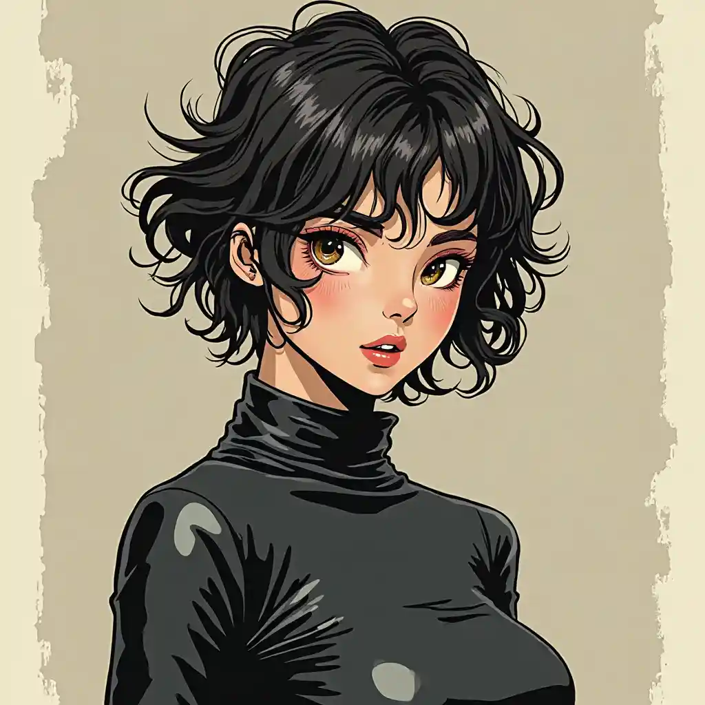 msichana wa Asia na nywele curly mfupi, amevaa tight ngozi turtleneck, manga graphic riwaya sanaa style