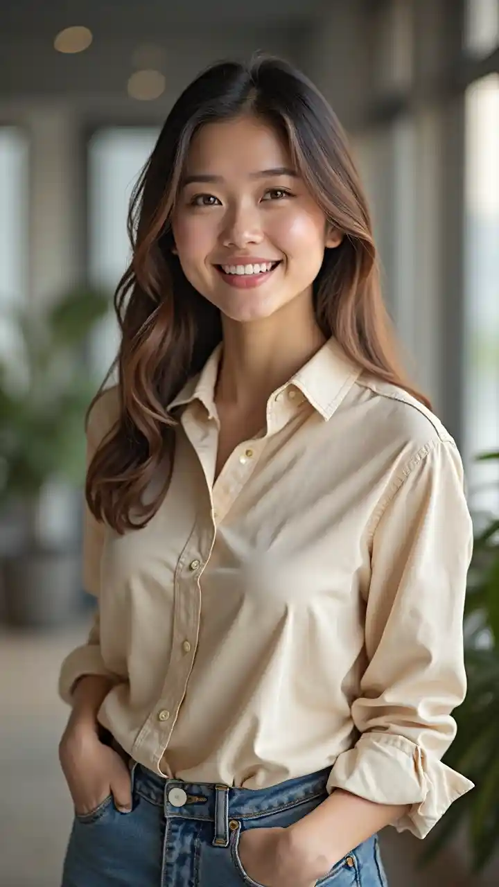 Asia Girl katika Beige Shirtwaist katika Coworking