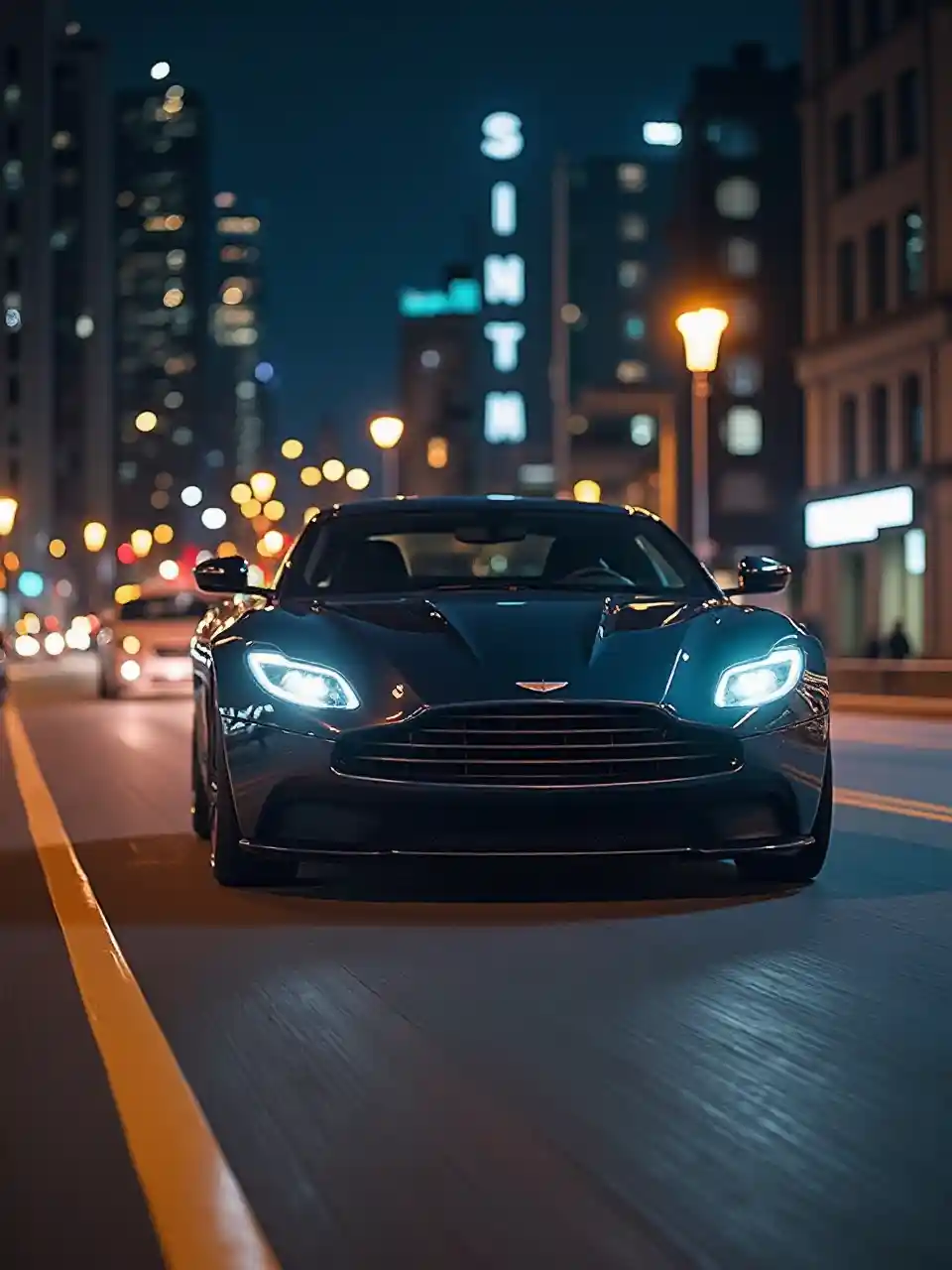 giza kijivu Aston Martin mbio kwa njia ya mji usiku