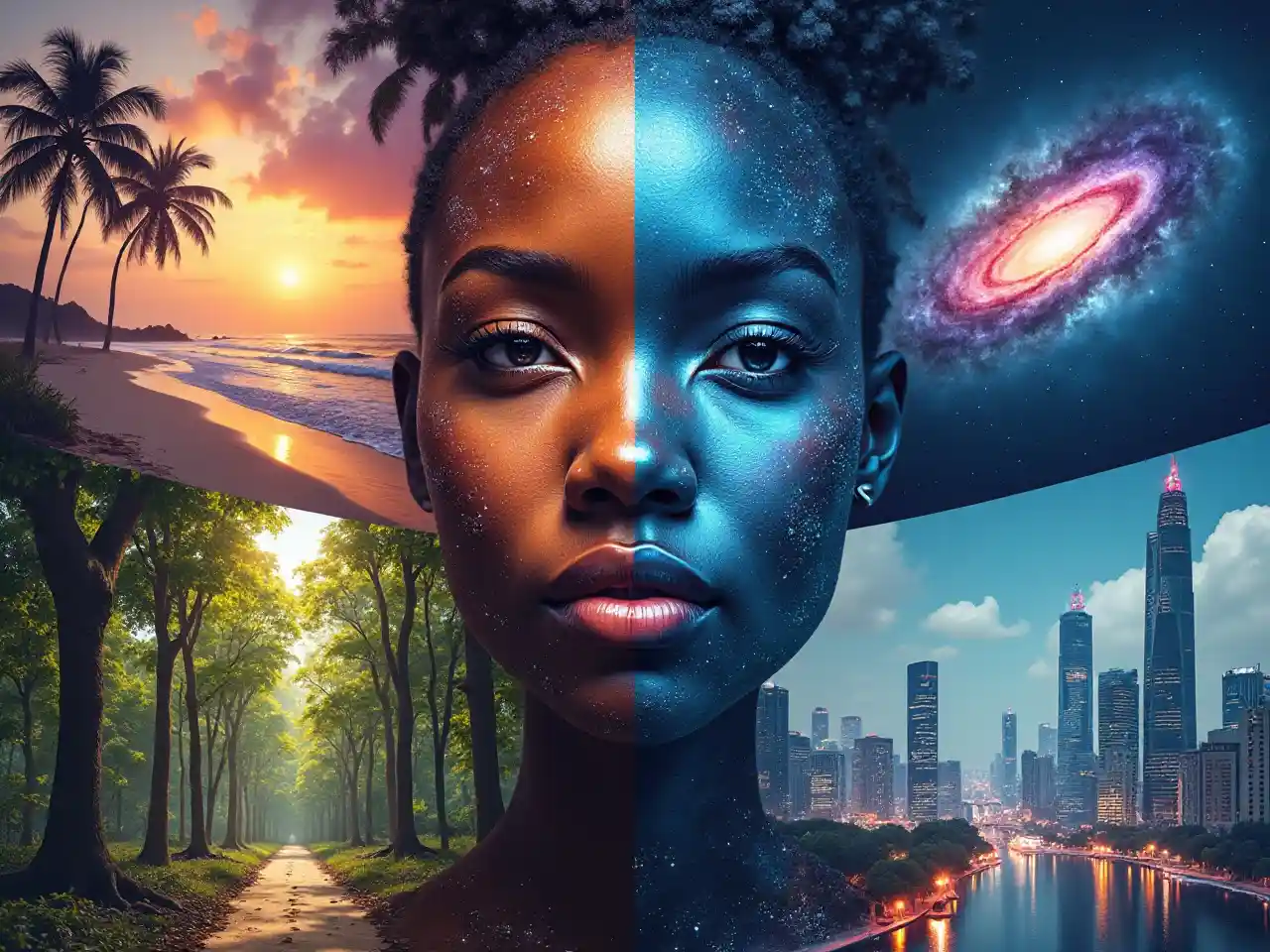 Unda picha ya uso iliyo na picha nne tofauti za nyota, na lengo kuu kuwa uso wa Afrika wenye sifa za juu. Sehemu ya juu kushoto inaonyesha machweo ya pwani yenye utulivu na anga laini na zambarau, mitende inayotikisika, na mawingu laini. Sehemu ya juu kulia inaonyesha anga lenye umbo la bluu, rangi ya waridi, na rangi ya zambarau, ikionyesha ulimwengu usio na mwisho. Sehemu ya chini kushoto inaonyesha msitu wenye majani mengi yenye miti mirefu, jua likitembea kupitia majani, na majani yanayoanguka. Sehemu ya chini kulia inaonyesha jiji la cyberpunk la baadaye lenye taa za neon, majengo ya juu ya teknolojia, na barabara za mijini. Maono hayo manne yanachangamana na sura ya Afrika, na kuunganisha mambo ya asili na ya ulimwengu na mambo ya wakati ujao ya mijini.