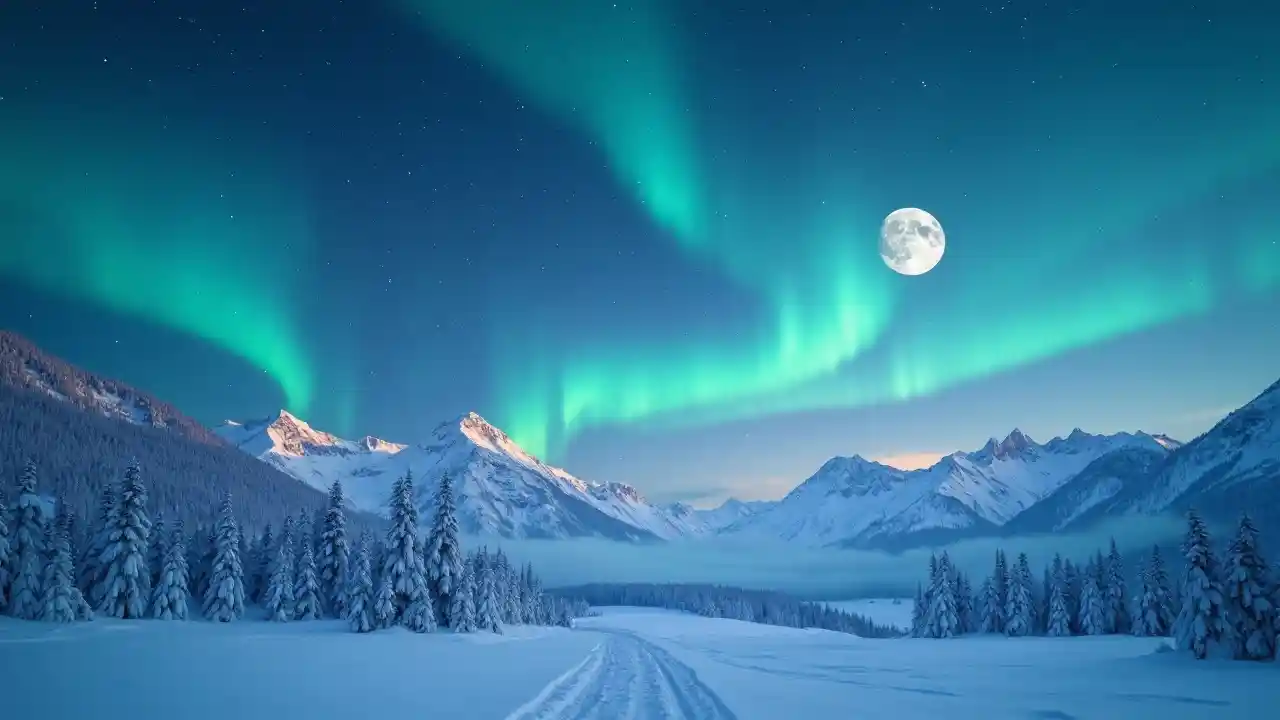 Nuru ya kaskazini inayoonekana juu ya safu ya milima yenye theluji, na mwezi kamili ukiangaza nyuma, mandhari ya majira ya baridi yenye mambo mengi