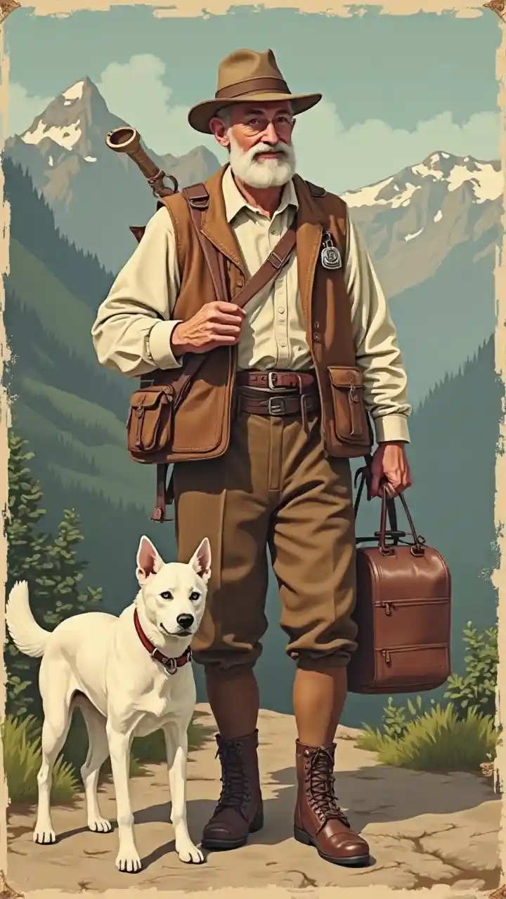 Picha ya nyuma ya msafiri wa kale wa Austria akiwa na mbwa mweupe, akiwa amevaa mavazi ya jadi ya Austria, nyuma na vitu