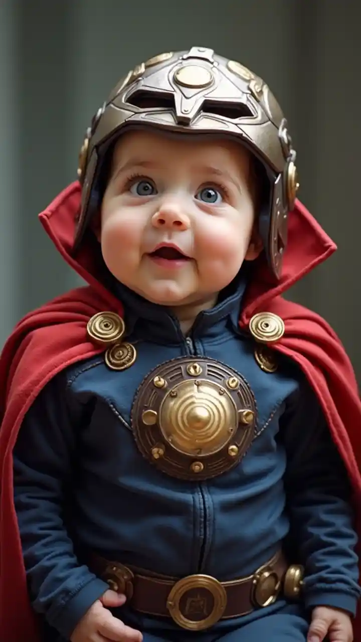 Picha hii ya kupendeza inaonyesha mtoto aliyevaa mavazi ya kigeni ya daktari, akichukua kiini cha shujaa huyo. Suti hiyo ina maelezo yaliyoundwa kwa uangalifu, ikiwa ni pamoja na kiini cha arc kwenye kifua na miundo ya kisasa kwenye kofia. Mavi ya mtoto na macho yake yenye kung'aa huwapa kipimo cha ziada ya kupendeza wakati wanaangalia kamera, inaonekana tayari kuchukua ulimwengu.