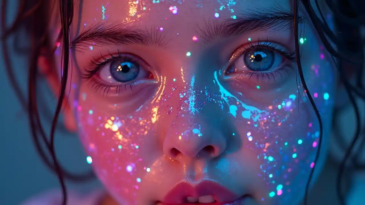 picha hyper kweli katika 4K ya macho wazi mtoto uso kwamba inaonekana amevaa ngozi ya pili ya kioo kioevu chuma juu ya uso wake kwamba inaangaza katika rangi ya neon na kuyeyuka mbali, sawa na Instagram
