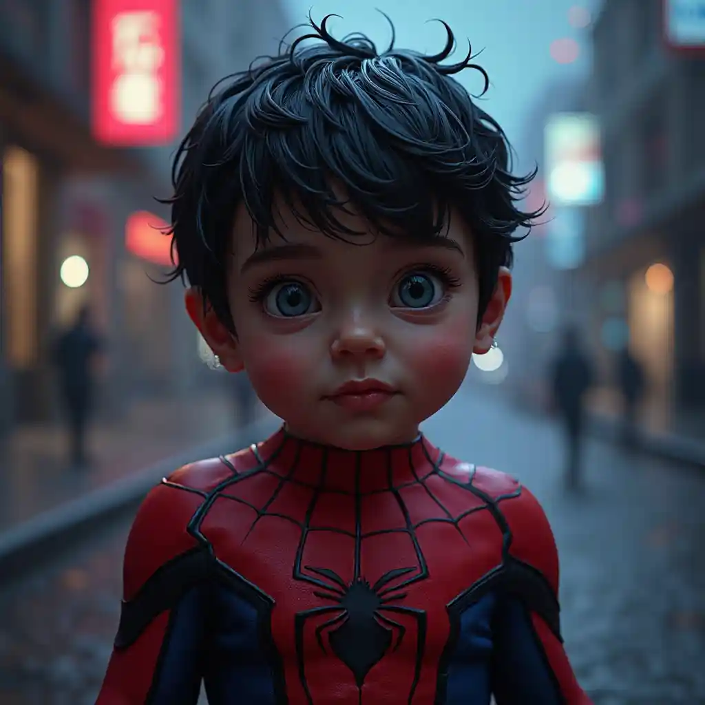 toleo la mtoto wa Spider Man ajabu na nywele nyeusi mwili kamili, hakuna mask, bila mask, uso kamili, mwanga wa neon photorealistic, masterpiece, full body photography, Ultra realistic, epic details, photorealistic, Cinematic, Ultra HD, Professional photography