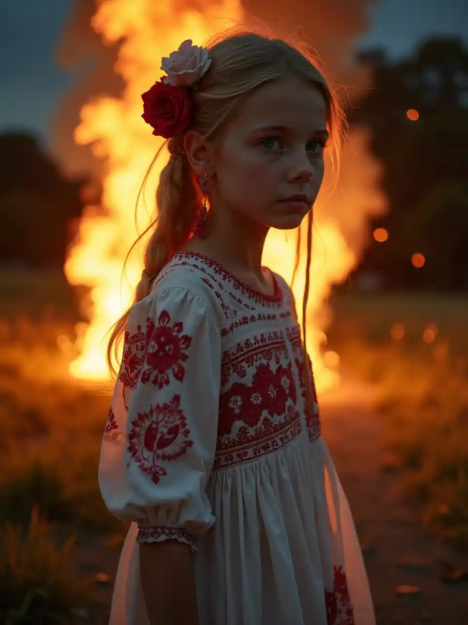 msichana blonde na macho ya bluu kutembea dhidi ya background ya moto usiku katika nguo nyeupe uwazi na mifumo nyekundu na nyeupe ya Balkan hadithi na roses juu ya kichwa chake katika nywele, cinematic, photorealistic