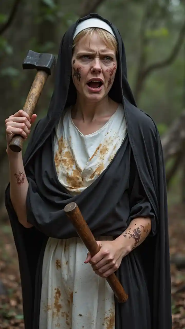 Muigizaji Julie Andrews katika jukumu lake kama mtawa katika sauti ya muziki, kuvaa costume yake mtawa, lakini kabisa kuvunjwa na chafu baada ya kuwa na mapigano na baadhi ya wanyama. Ana mikwaruzo mikononi, mikononi na usoni na anaonekana mkali. Ana shoka mkononi.