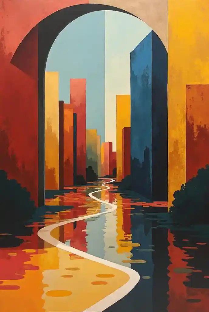 Uwakilishi wa jiji katika mtindo wa Bauhaus ulioonyeshwa katika kioo kilichopinda. Kutumia maumbo rahisi ya jiometri na vitalu ya rangi safi (redmelho, azul, amarelo, nyeusi na