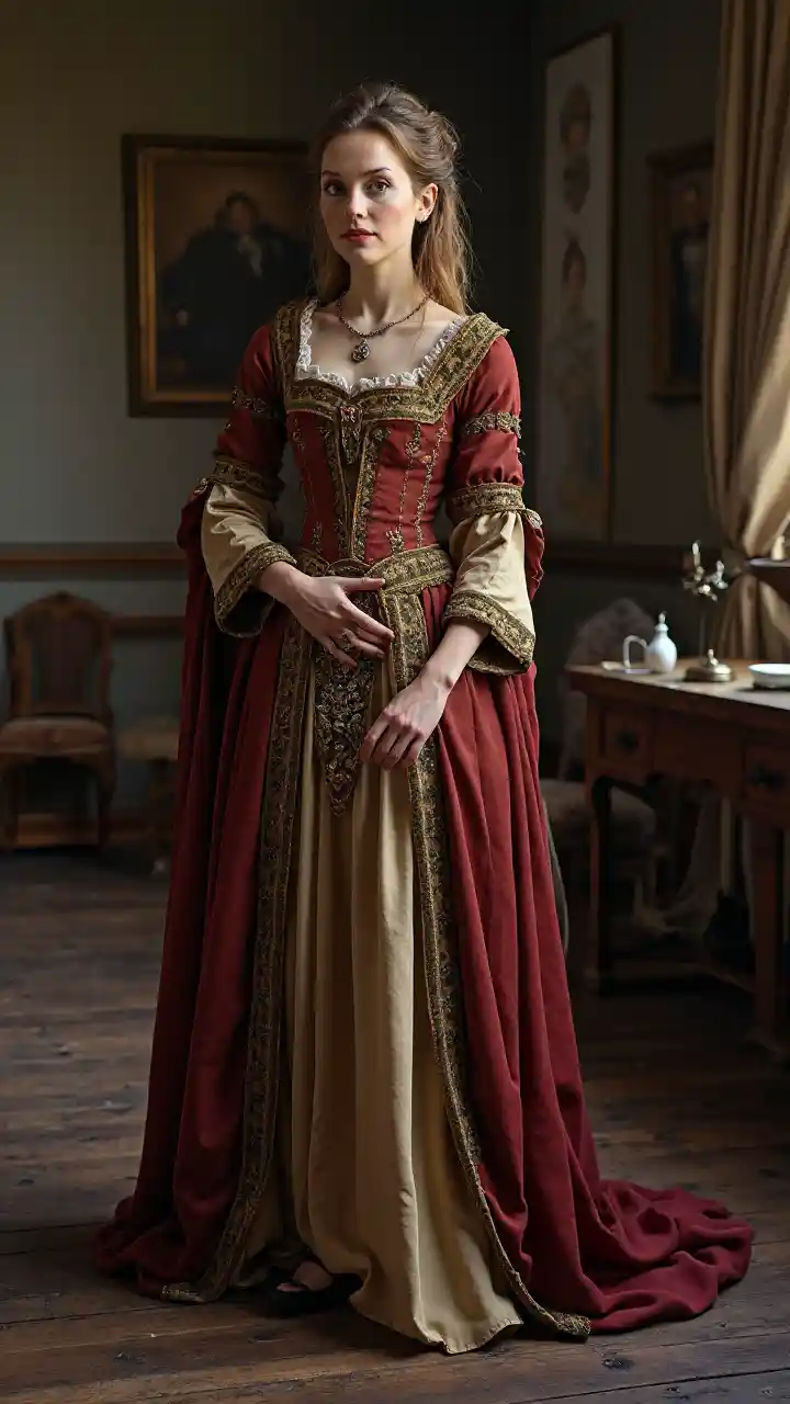 Picha kamili ya mwanamke mwenye umri wa miaka 60 wa Duchy ya Bavaria katika Bavaria ya medieval mwaka 1350AD amesimama katika chumba cha kulala cha medieval. Ana nywele kufanywa katika medieval Bavarian Ireland style. Anavaa mavazi ya Bavaria ya enzi ya kati. Anavaa uso wa Bavaria wa enzi za kati na mapambo ya mwili..