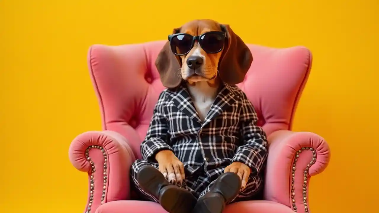 kipenzi kuangalia beagle, ameketi juu ya tufted nyekundu ngozi kiti na, background mkali njano, amevaa gharama kubwa 3 kipande checked suti, na miwani kubwa nyeusi, mikono katika paja, mwili mzima na viatu nyeusi, glavu nyeusi ngozi, viatu nyeusi ngozi, akikabili mbele, super crisp, picha 80d, mwanga, ajabu