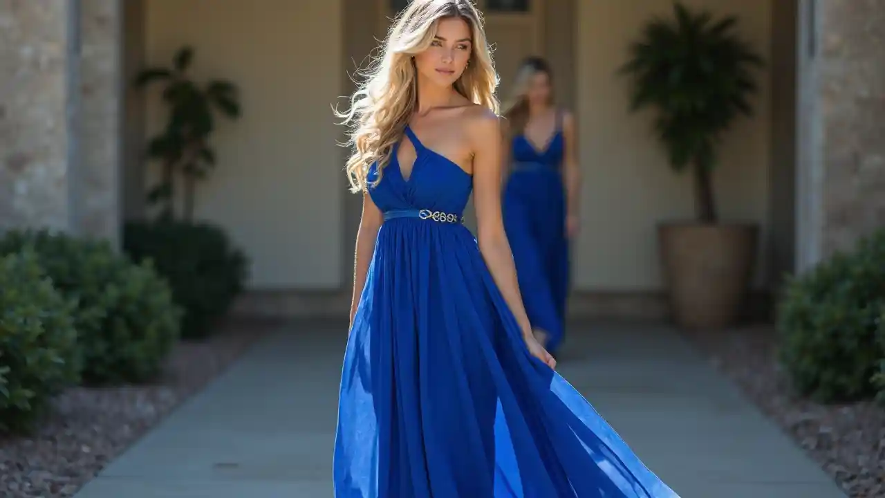 yule blonde mchanga mrembo alikuwa amevaa vazi refu lisilo na mikono lenye rangi ya bluu ya kifalme, lililotengenezwa kwa hariri na kitambaa cha kifuani. Ilikuwa na kubuni kuvutia kuanguka chini kutoka mstari wa shingo oval katika overlapping kitambaa. Kiuno kilifafanuliwa na mshipi mwembamba wa bluu wenye kifungo cha chuma na sketi nyepesi iliyokuwa imerundika kabisa sakafuni. Alivaa viatu vinavyolingana na viatu vya viatu vya viatu vya viatu vya viatu vya viatu vya viatu vya viatu vya viatu vya viatu