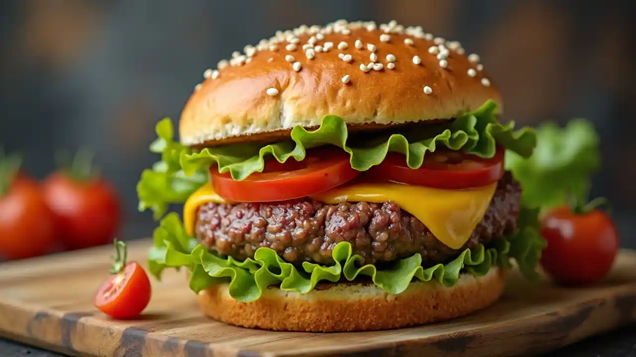 hamburger ladha na nyama ya ng'ombe, jibini, nyanya, saladi,