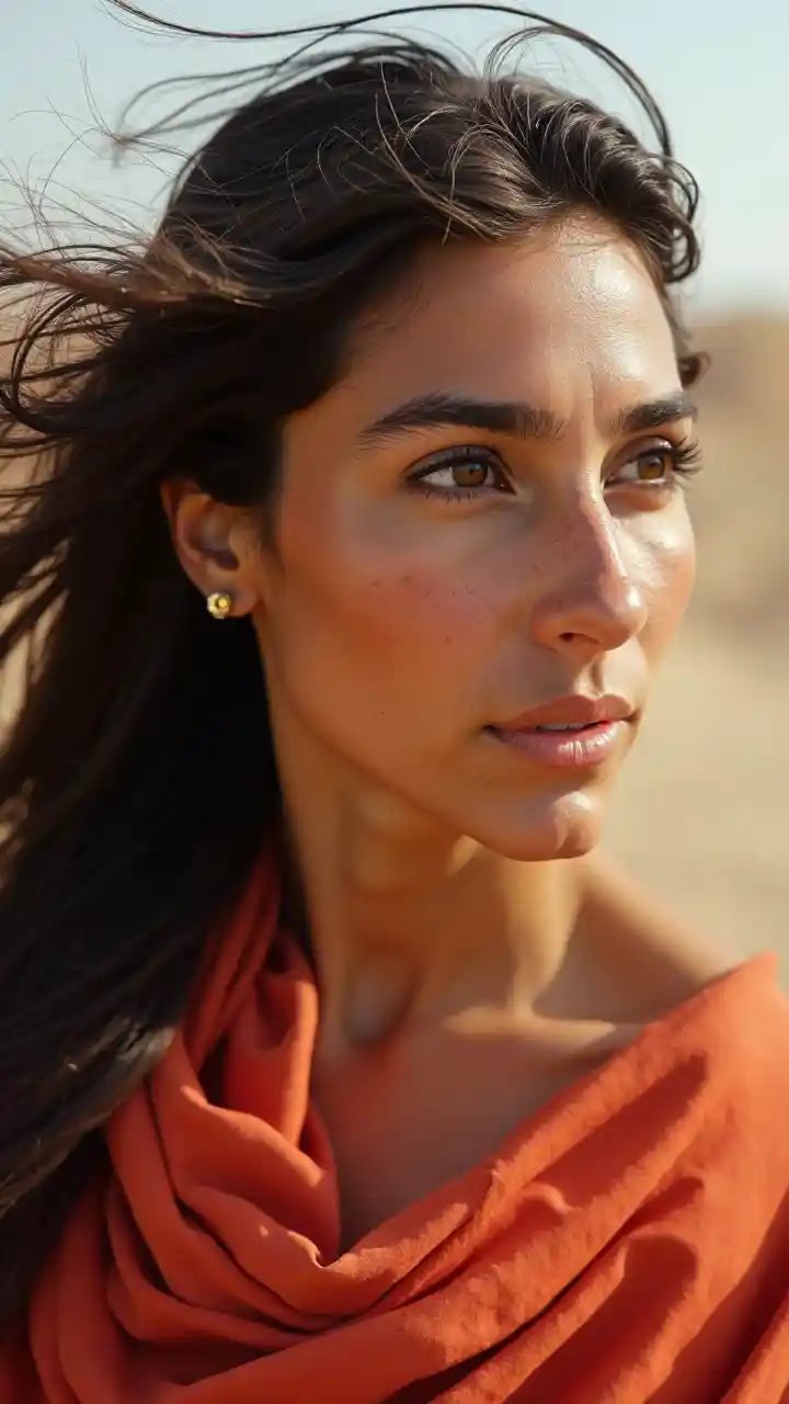picha photorealistic ya mwanamke Berber kutoka Biblia, kelele pete, mtazamo upande, macho ya kahawia, ngozi ya mizeituni, tanned, nywele zinazoendelea katika upepo, kina sana, uso wa kweli, ngozi texture, kina sana ngozi, peach fuzz, amevaa nguo nyekundu, Israeli uzuri, kushinda picha, Nikon d850 filamu kumbukumbu, kina sana, ajabu, maelezo, rangi tajiri, texture hyper kweli, taa ya ajabu, injini ya kweli, trend kwenye artstation, 3/4 mwili, picha halisi, RAW, ubora wa juu, ufafanuzi wa juu, mkali