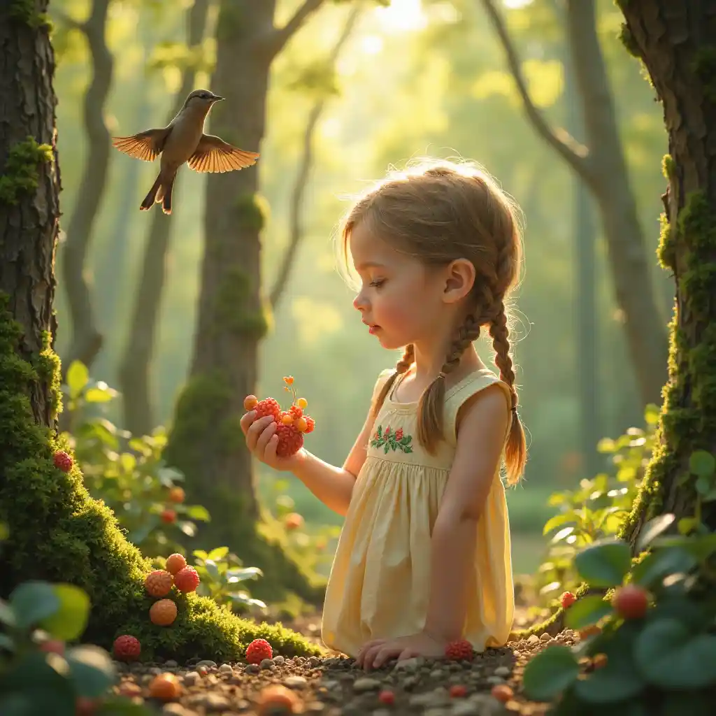 Msichana mweupe mwenye umri wa miaka 7 mwenye mikunjo anakusanya beri katika msitu wenye jua, akiwa amevaa vazi lenye mikunjo ya majani. Ndege wanaopaa na miti yenye moshi humweka katika mazingira ya kawaida, na nywele zake zenye uangalifu hutoa nuru ya utulivu na furaha ya jua.