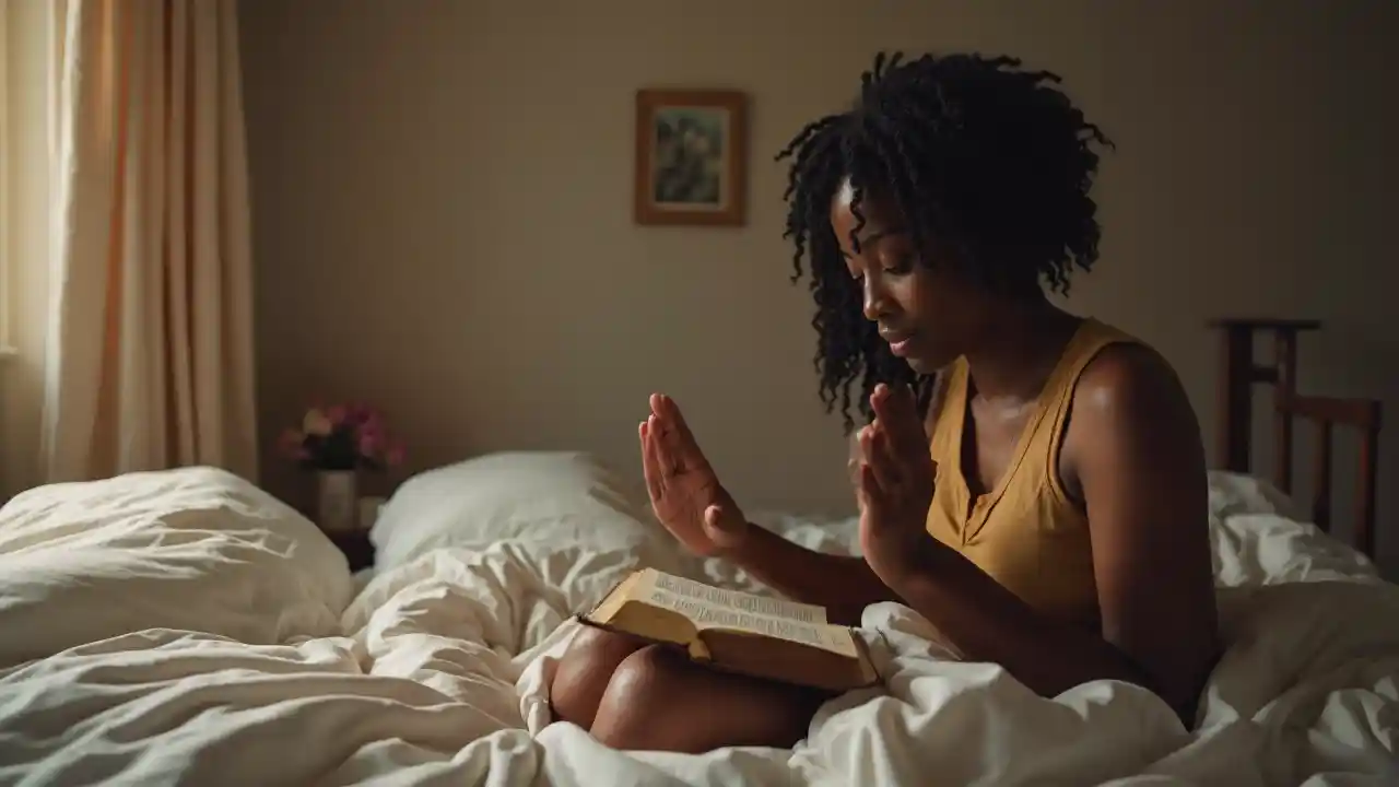 BenjaminMwanamke mweusi ameketi kitandani mwake akiomba na Biblia Takatifu