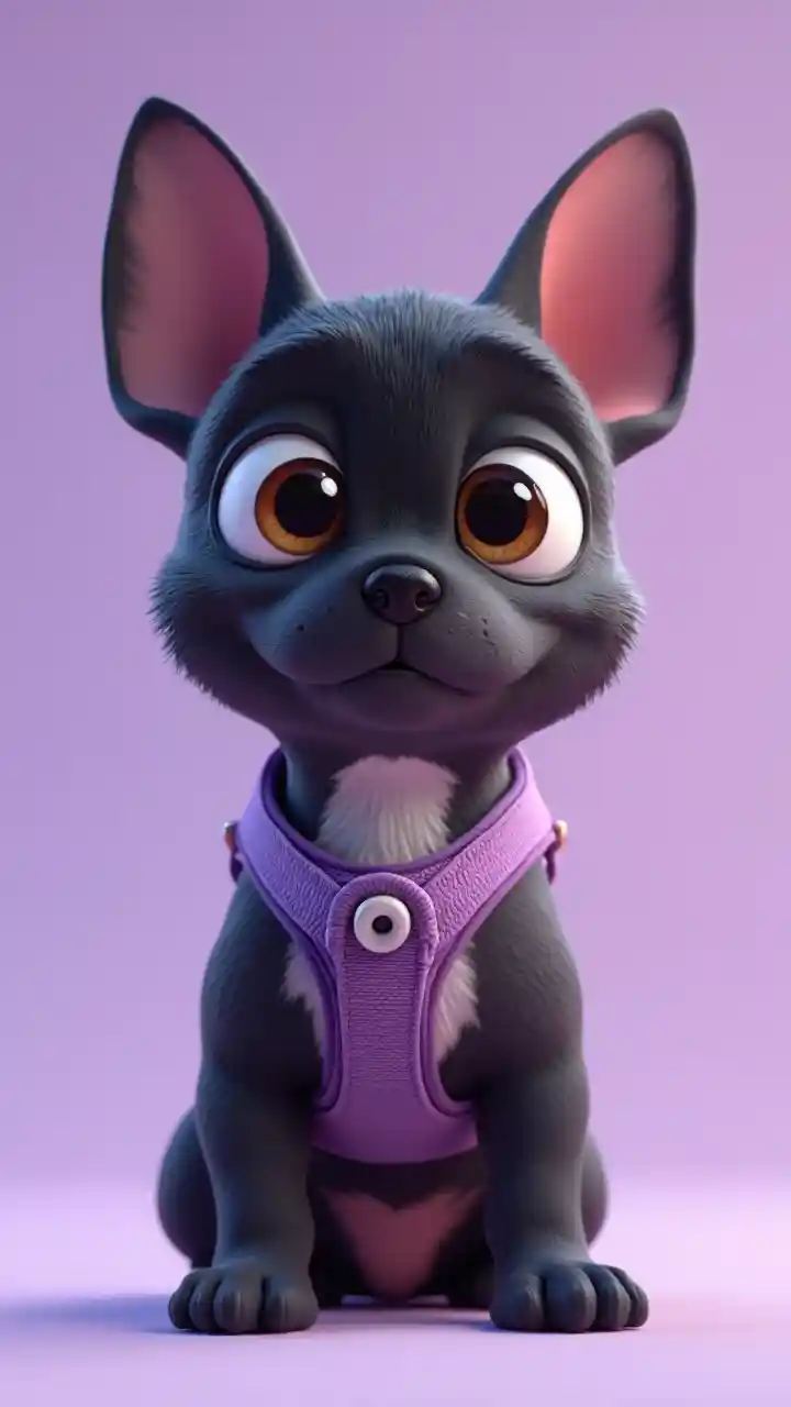 SkylarBlack Bulldog Kifaransa na kifua nyeupe, kubwa cute macho ya kahawia, amevaa harness rangi ya zambarau juu ya asili ya rangi ya zambarau katika mtindo wa Disney Pix 3d