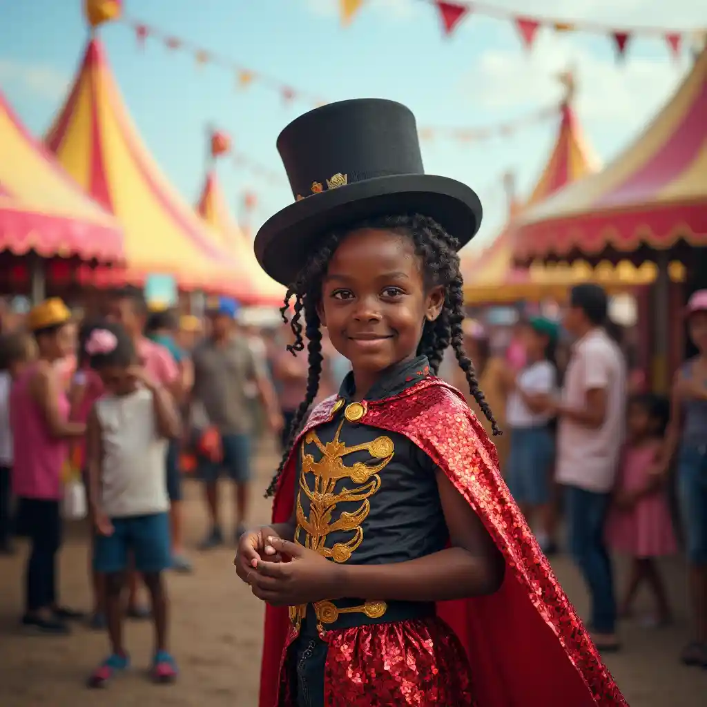 Akitenda kazi ya uchawi kwenye sherehe ya karamu, msichana mweusi mwenye umri wa miaka 9 anavaa kanzu yenye kung'aa na kofia ya juu. Mahema yenye rangi na umati wenye shangwe humweka katika mazingira yenye furaha.