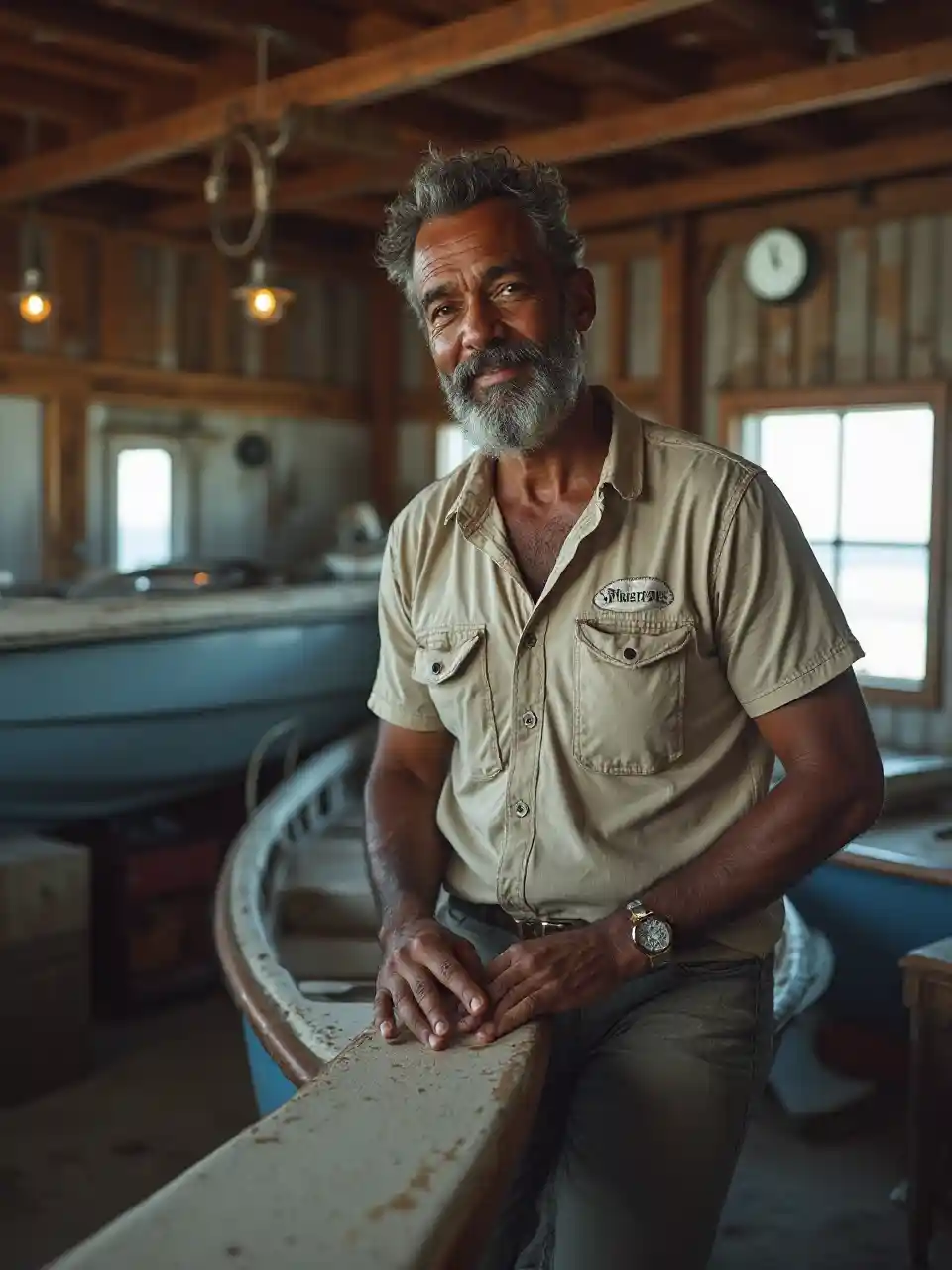 Akirudisha mashua ya kawaida kwenye karakana ya pwani, mtu mweusi mwenye umri wa miaka 50 na kitu anaangaza katika shati la mfanyakazi. Vifaa vya baharini na mandhari ya bahari humweka katika mandhari, mikono yake yenye ustadi ikitoa umaridadi wa baharini.