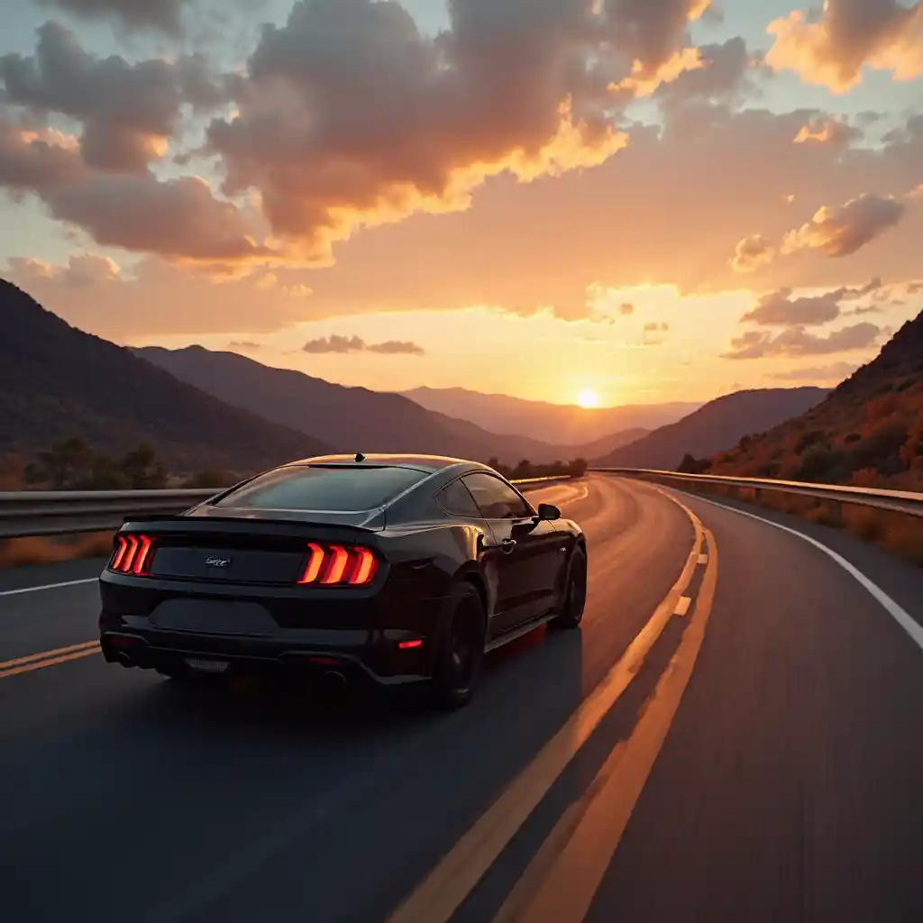 Black Ford Mustang Kuendesha kwa kasi wakati wa jua