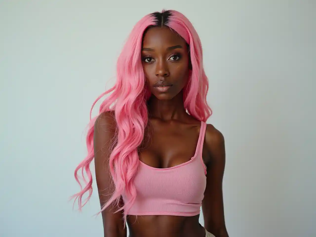 Mwanamke mweusi mwenye nywele ndefu za waridi na nguo za juu